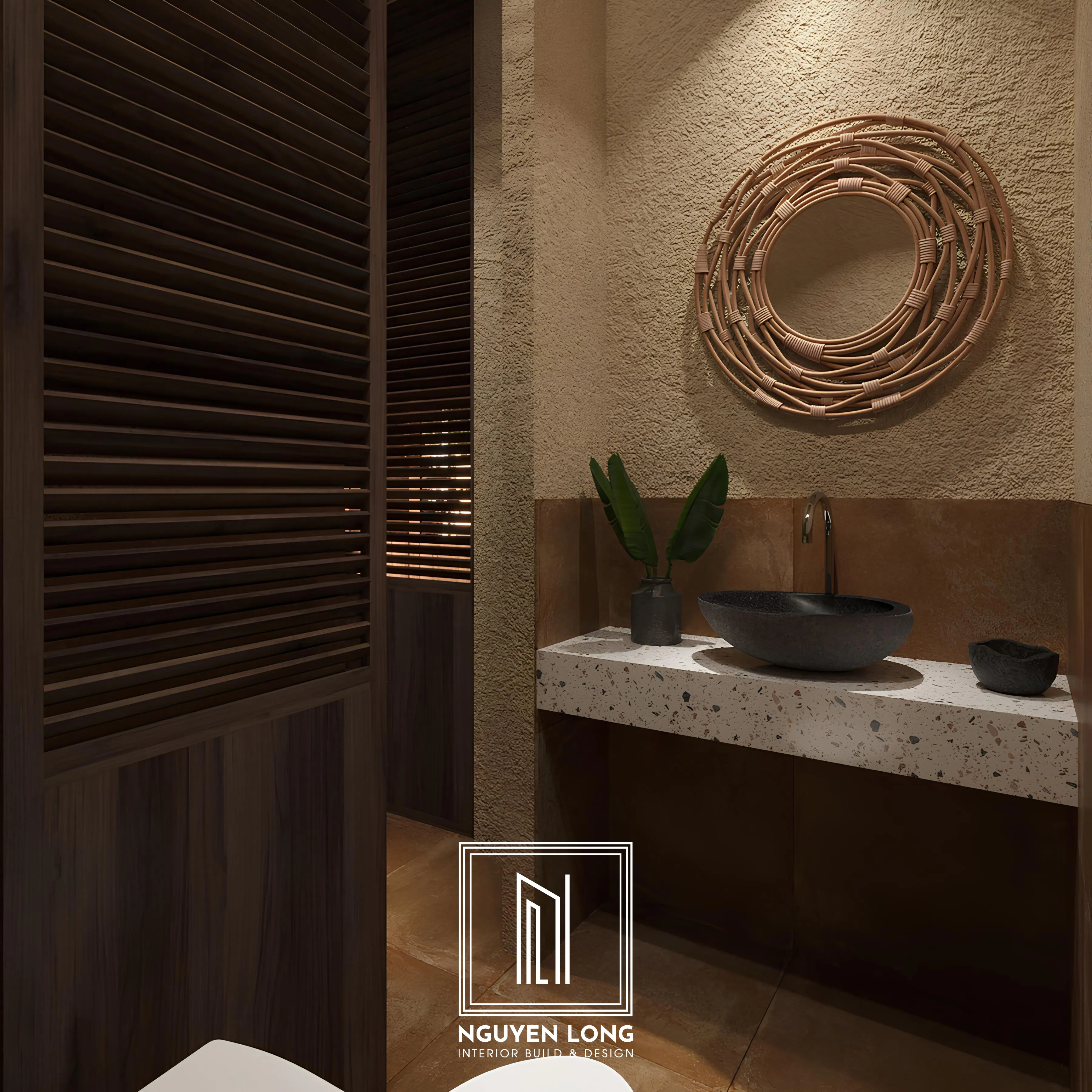 Khu vực vệ sinh: Sử dụng chậu rửa bằng đá tự nhiên và gương viền mây tre, mang lại vẻ đẹp tĩnh tại và sạch sẽ.