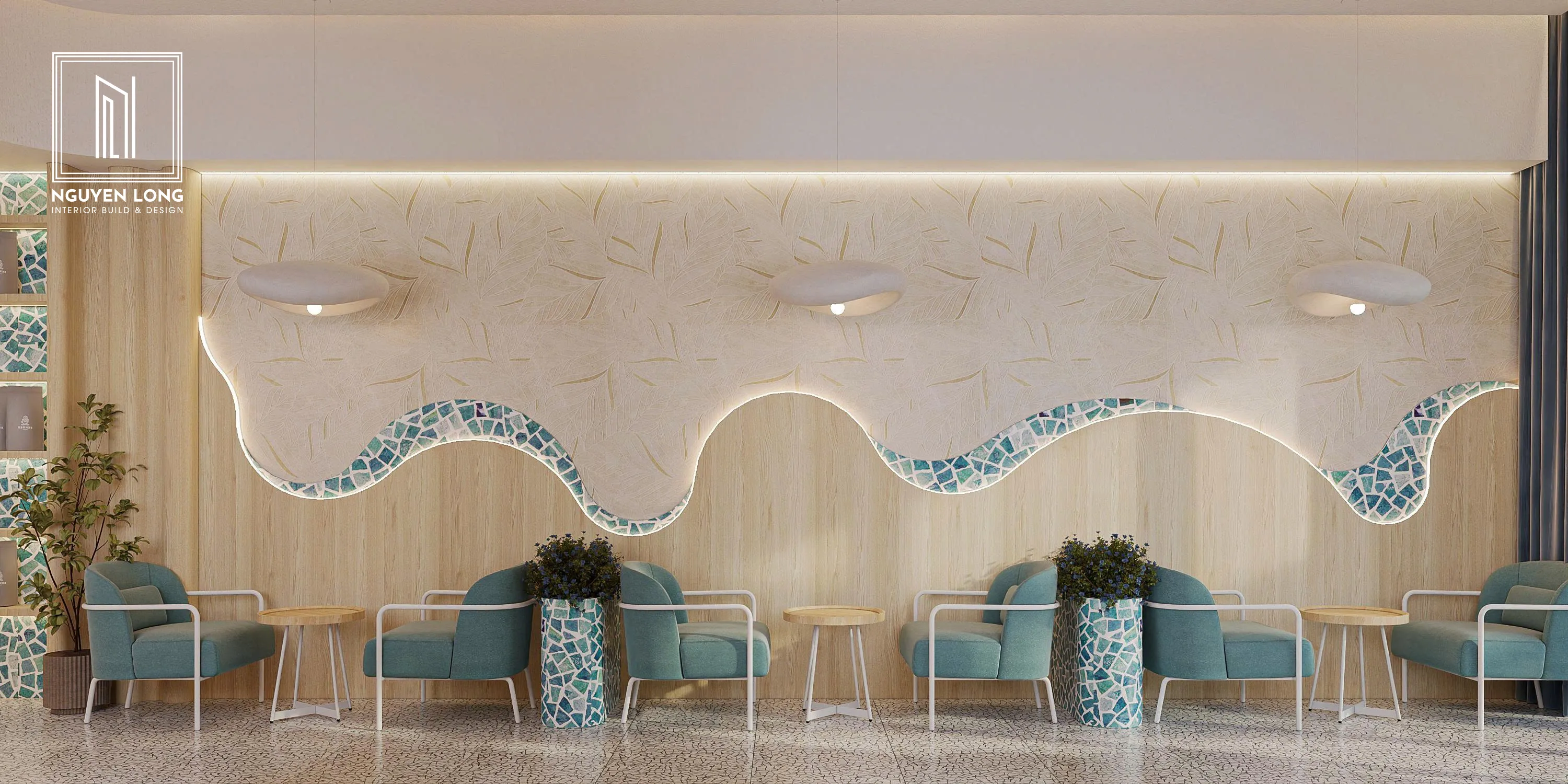 Đường sóng uốn lượn: Những dải Mosaic xanh kết hợp cùng hệ đèn LED chạy dọc tường tạo cảm giác như những con sóng đang xô bờ.