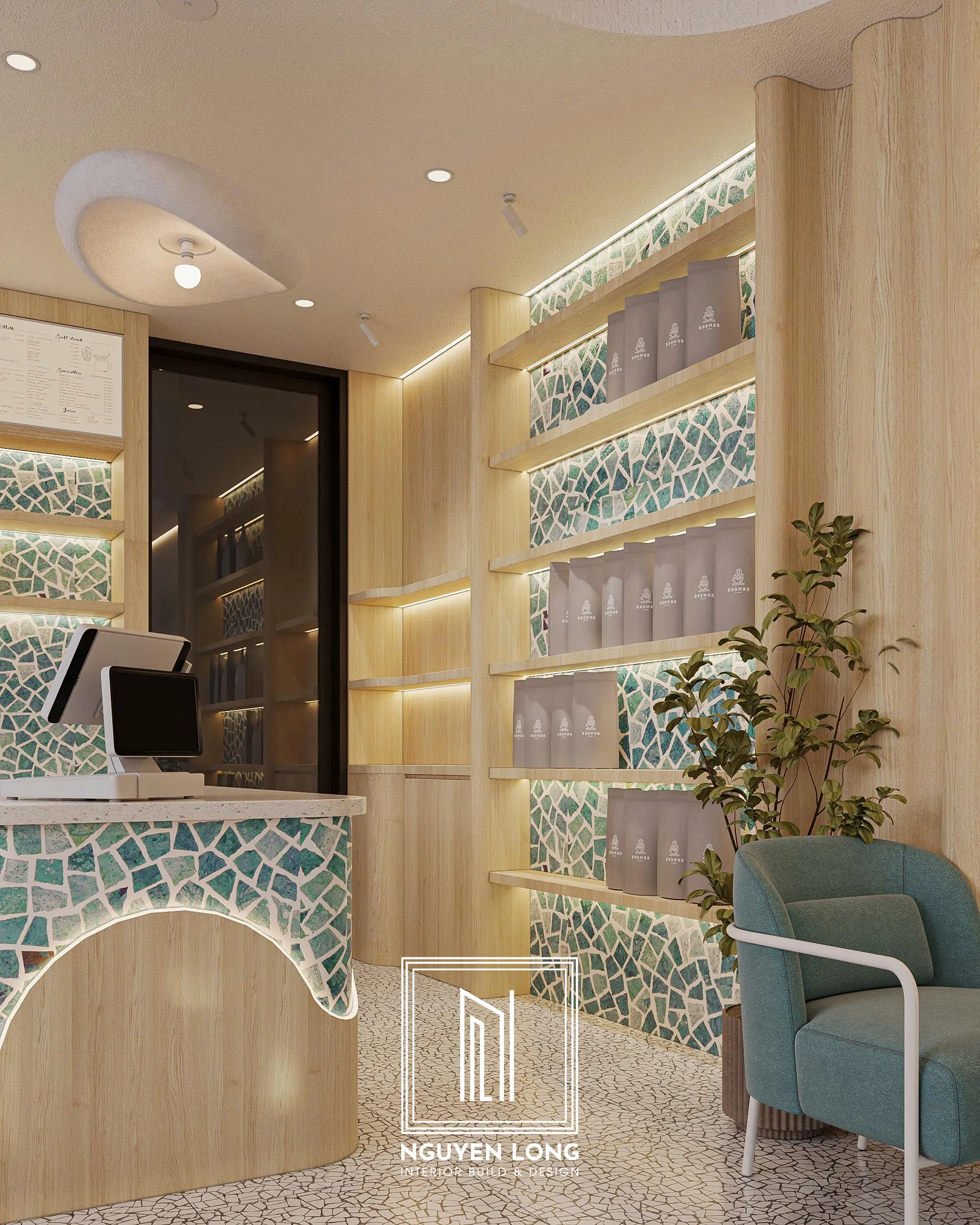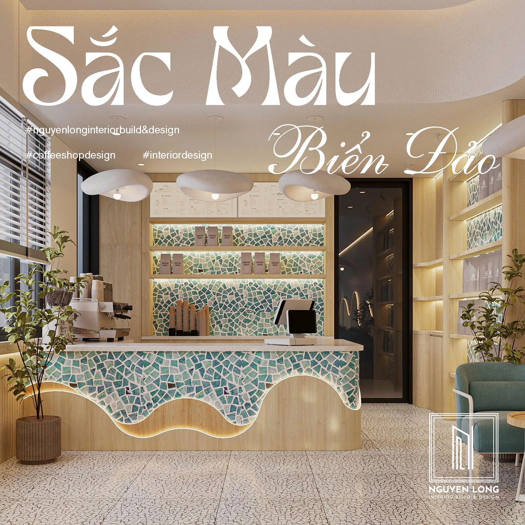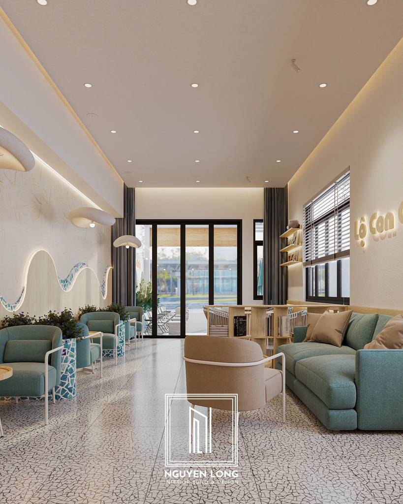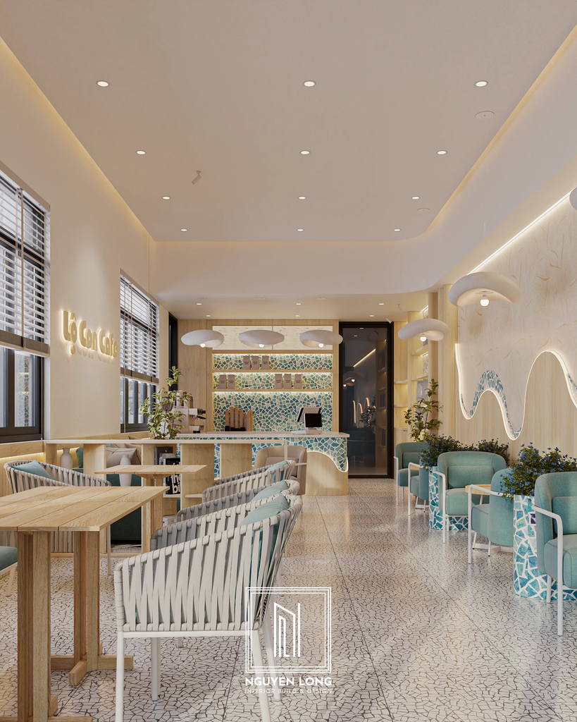 Nếu các dự án trước đó mang vẻ trầm mặc, ấm áp thì Lộ Con Cafe lại là một bản hòa ca rực rỡ của nắng, gió và những con sóng xanh. Với sự kết hợp tinh tế giữa chất liệu gỗ sáng màu và nghệ thuật Mosaic, Nguyen Long Interior đã biến một không gian nhà phố thành một điểm hẹn "Chill" đậm chất nghỉ dưỡng.