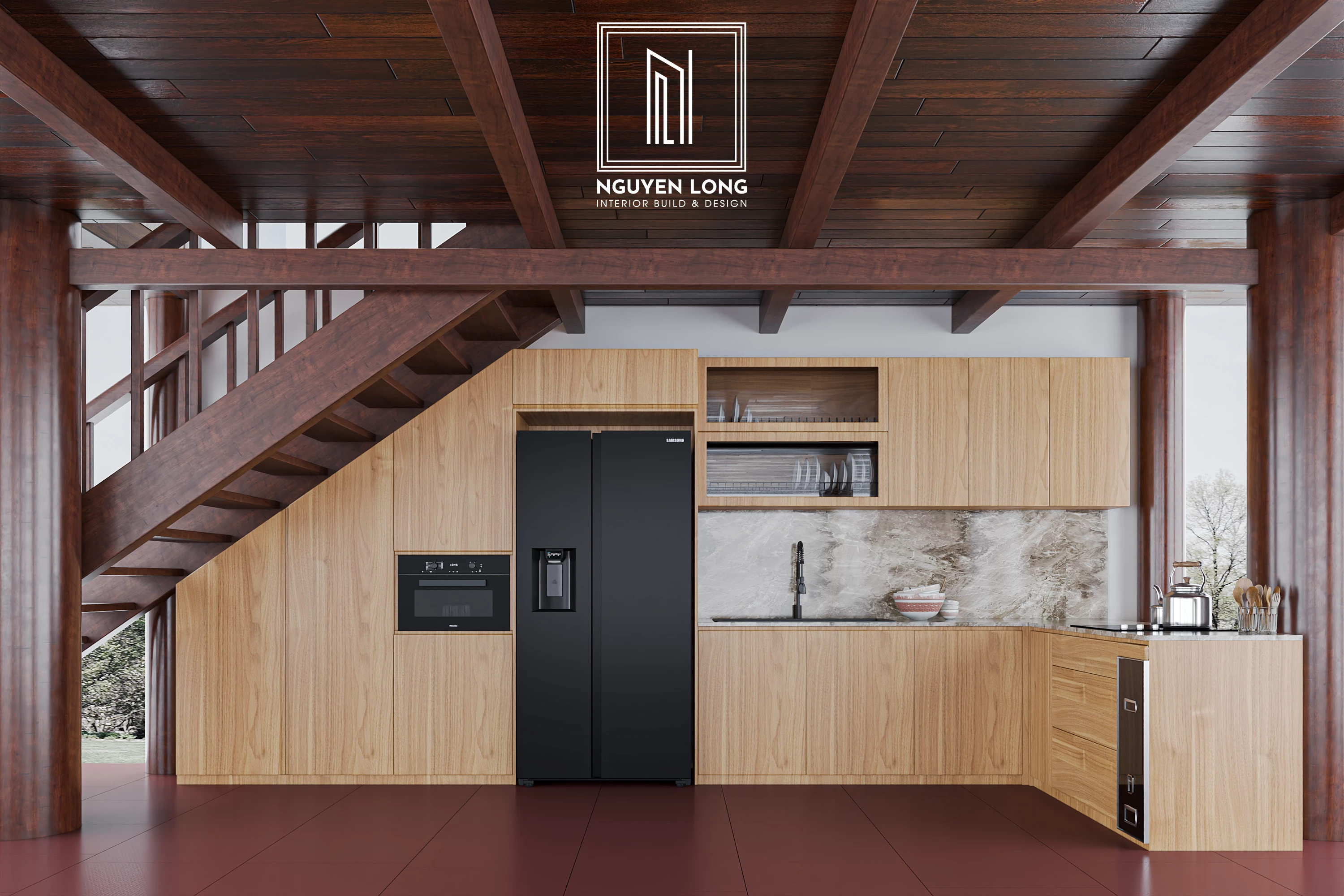 Hệ tủ bếp hiện đại: Tủ bếp được thiết kế kịch trần với tông màu gỗ đồng bộ, tích hợp các thiết bị hiện đại nhưng vẫn hài hòa với tổng thể mang nét Rustic của căn nhà.
