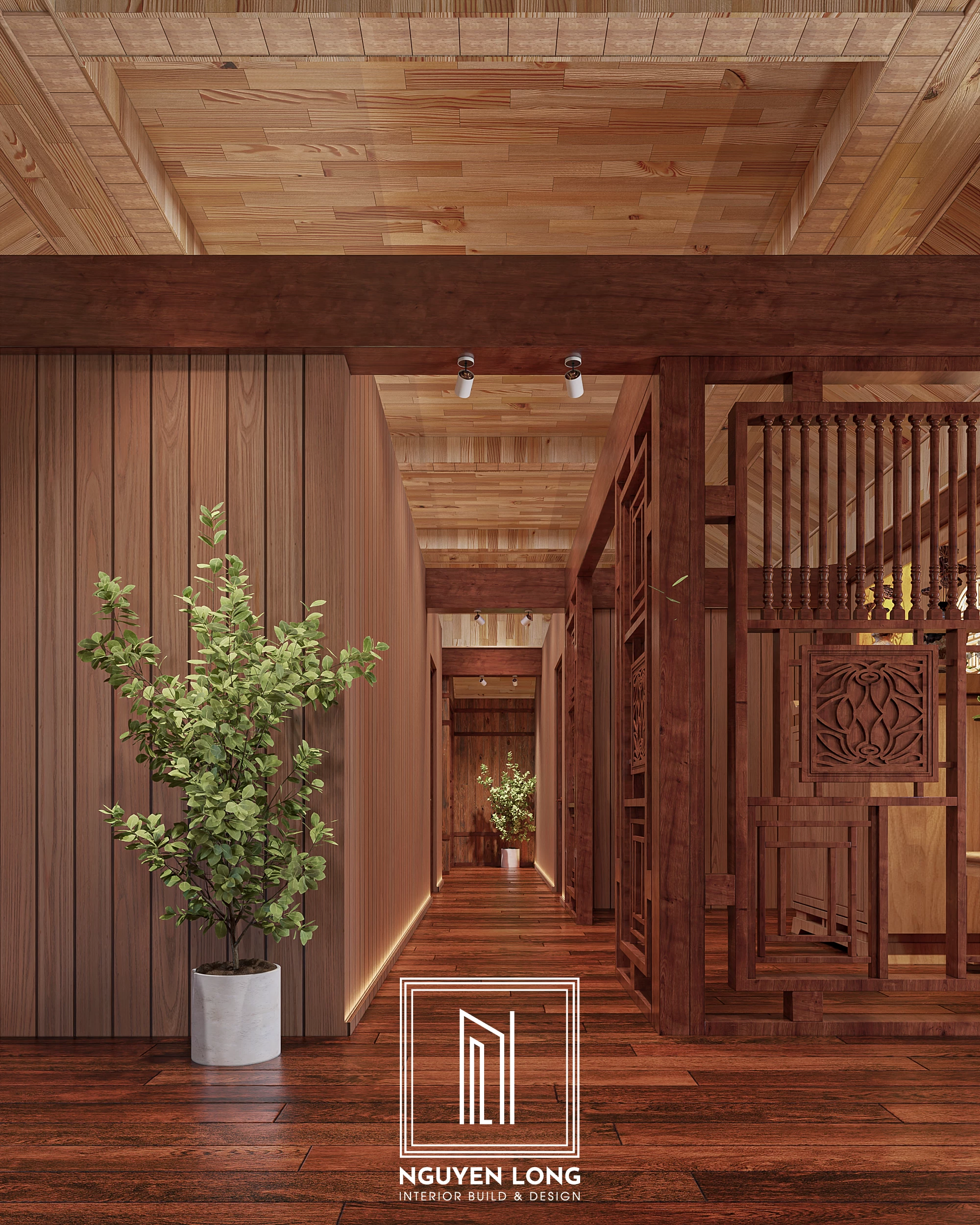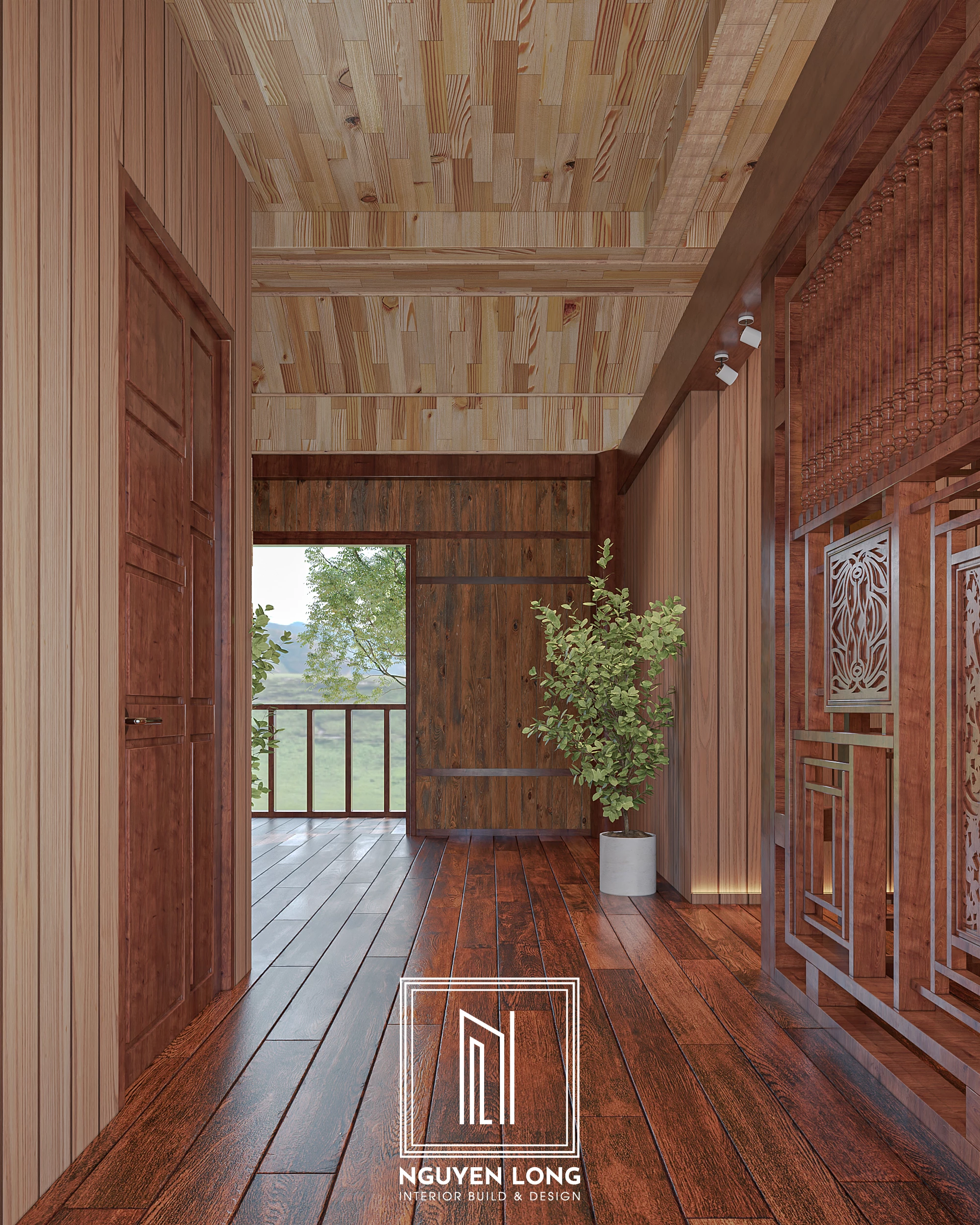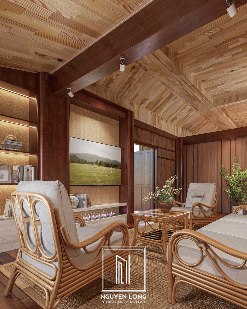 Hệ trần gỗ cách điệu: Lấy cảm hứng từ mái nhà truyền thống, hệ trần gỗ được thiết kế với các đường xà ngang mạnh mẽ, tạo cảm giác bề thế và ấm cúng cho toàn bộ ngôi nhà.