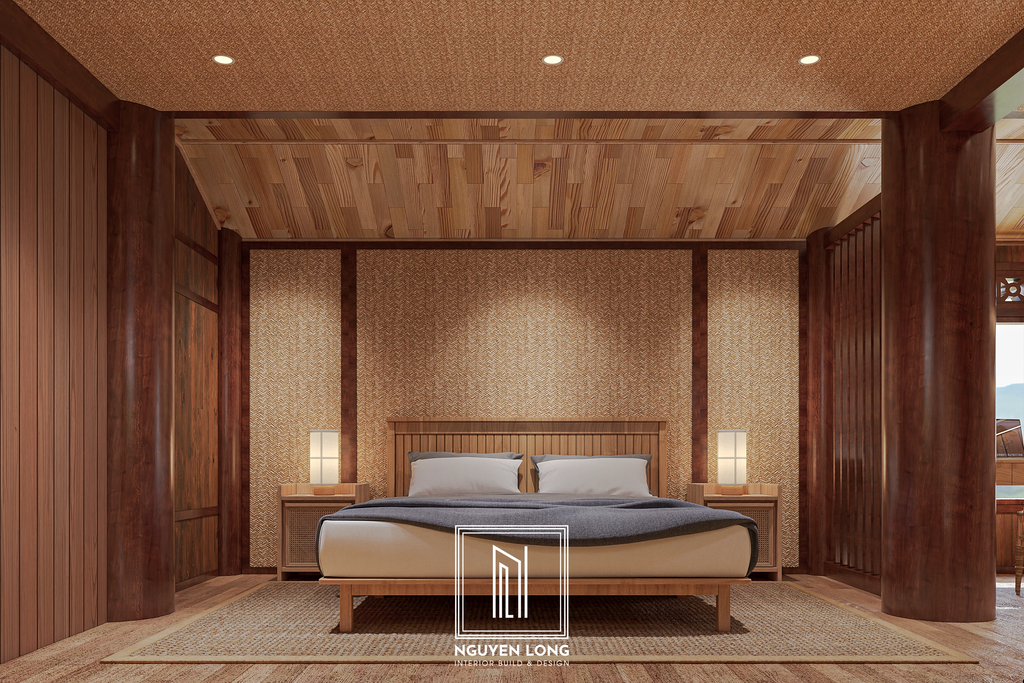 Thiết kế platform bed: Thay vì sử dụng giường truyền thống, chúng tôi thi công hệ giường bục kịch tường, tận dụng toàn bộ chiều rộng căn phòng để tạo ra bề mặt nghỉ ngơi rộng rãi mà không làm cảm giác không gian bị xé nhỏ.