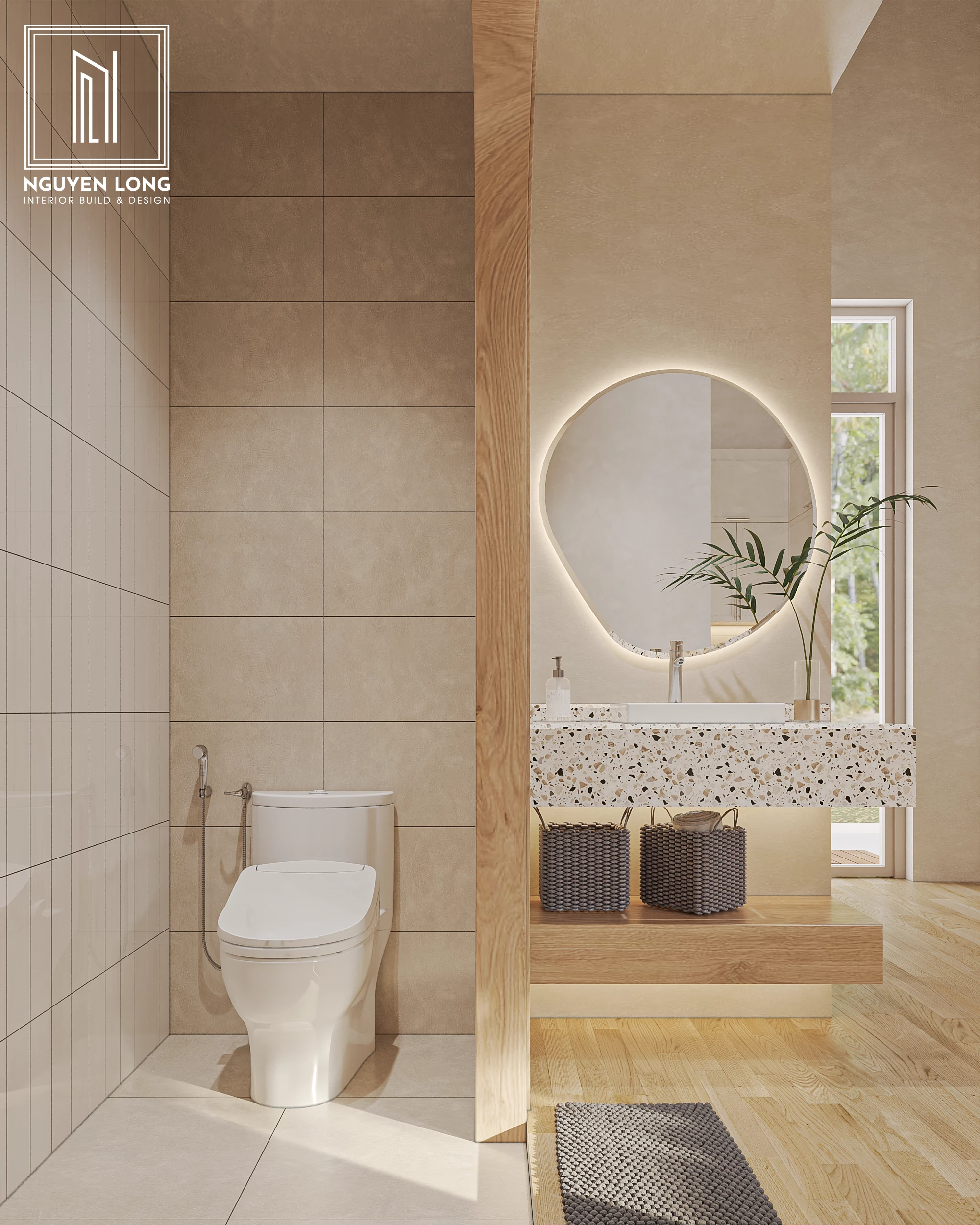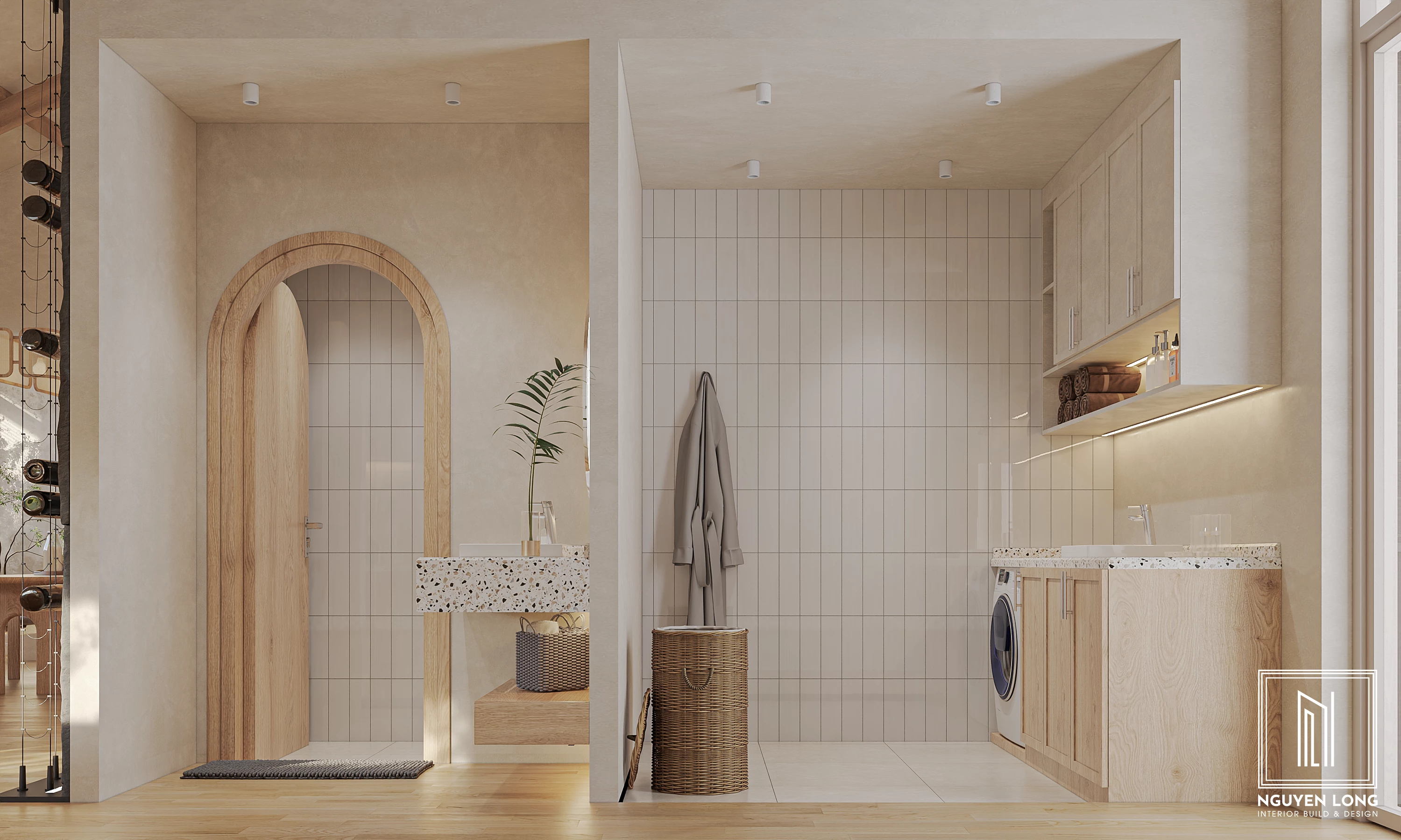 Khu vực giặt sấy & vệ sinh: Ngay cả những không gian phụ cũng được Nguyễn Long Interior chăm chút với hệ cửa vòm gỗ, gạch ốp thẻ dọc và bố trí công năng cực kỳ gọn gàng.