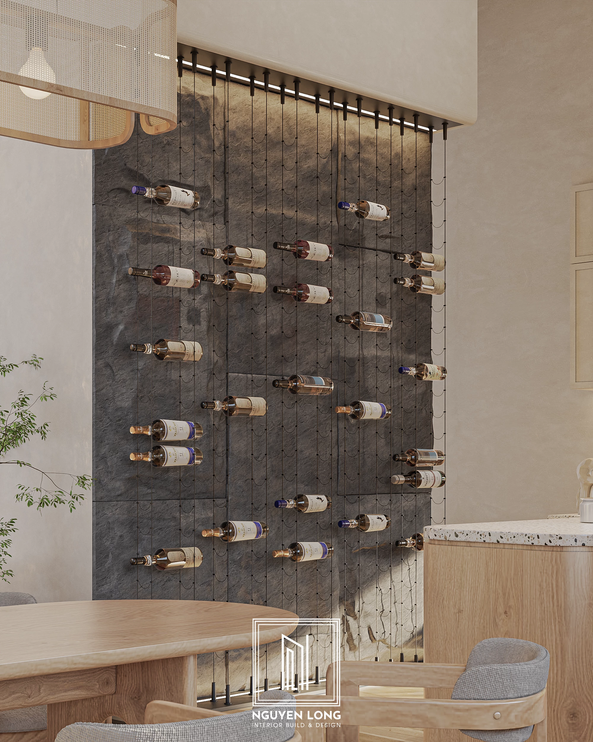 Điểm nhấn tủ rượu: Một thiết kế đột phá với hệ giá treo thanh mảnh trên nền đá tự nhiên tối màu, biến khu vực lưu trữ thành một tác phẩm nghệ thuật hiện đại.