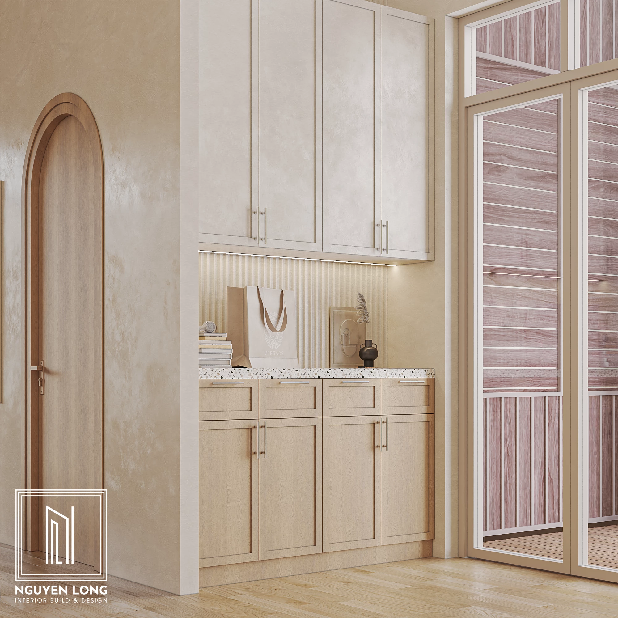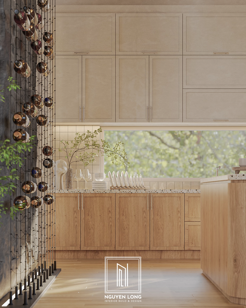 Hệ tủ lưu trữ thông minh: Thiết kế tủ cao sát trần với tone màu kem đồng nhất giúp không gian gọn gàng nhưng vẫn sang trọng. Mặt đá mài Terrazzo tiếp tục được sử dụng để tạo sự kết nối với khu vực bếp.