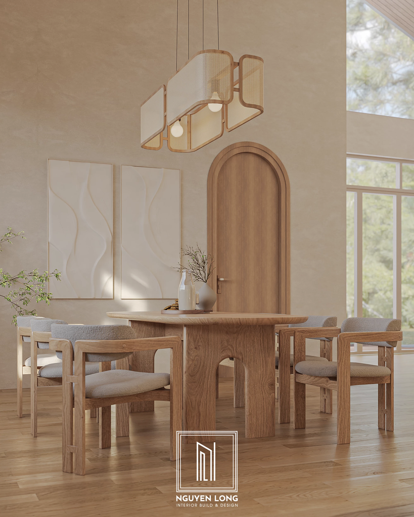 Nội thất điêu khắc: Bộ bàn ăn gỗ sồi với thiết kế chân vòm độc đáo không chỉ là nơi dùng bữa mà còn là một tác phẩm nghệ thuật khối. Ghế ăn bọc vải bouclé mềm mại tạo sự tương phản thú vị với chất liệu gỗ cứng cáp.