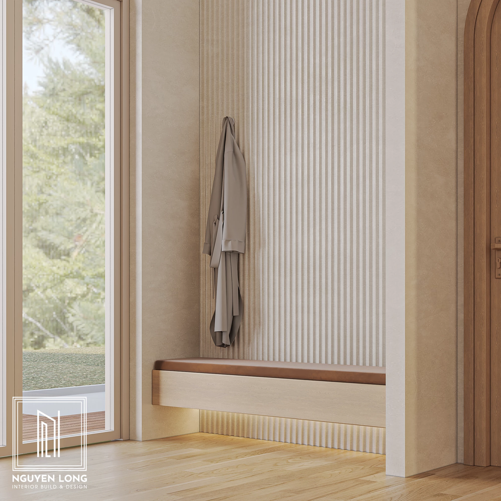 Góc chờ tinh tế: Băng ghế nghỉ được thiết kế âm tường kết hợp cùng vách nan dọc và hệ đèn led hắt sáng, tạo nên một khoảng nghỉ đầy cảm hứng ngay lối đi.
