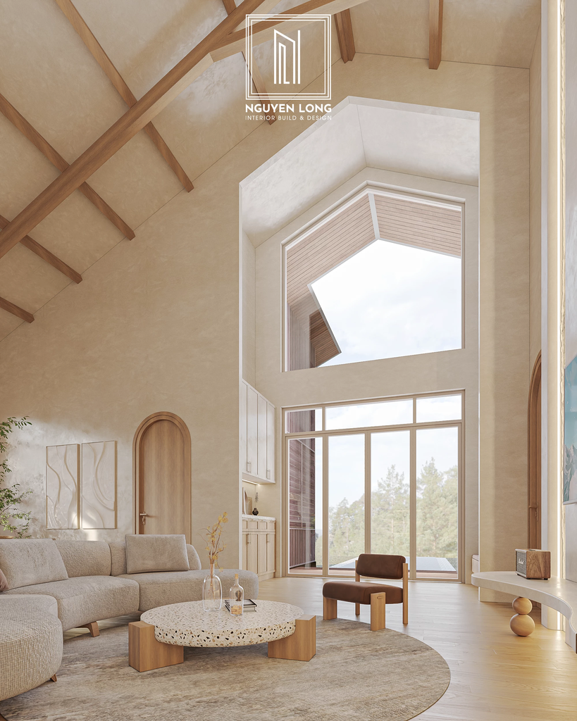 Kiến trúc thông tầng: Hệ trần dốc với xà gỗ lộ thiên không chỉ tạo cảm giác rộng rãi mà còn gợi nhắc đến sự ấm cúng của những ngôi nhà truyền thống.