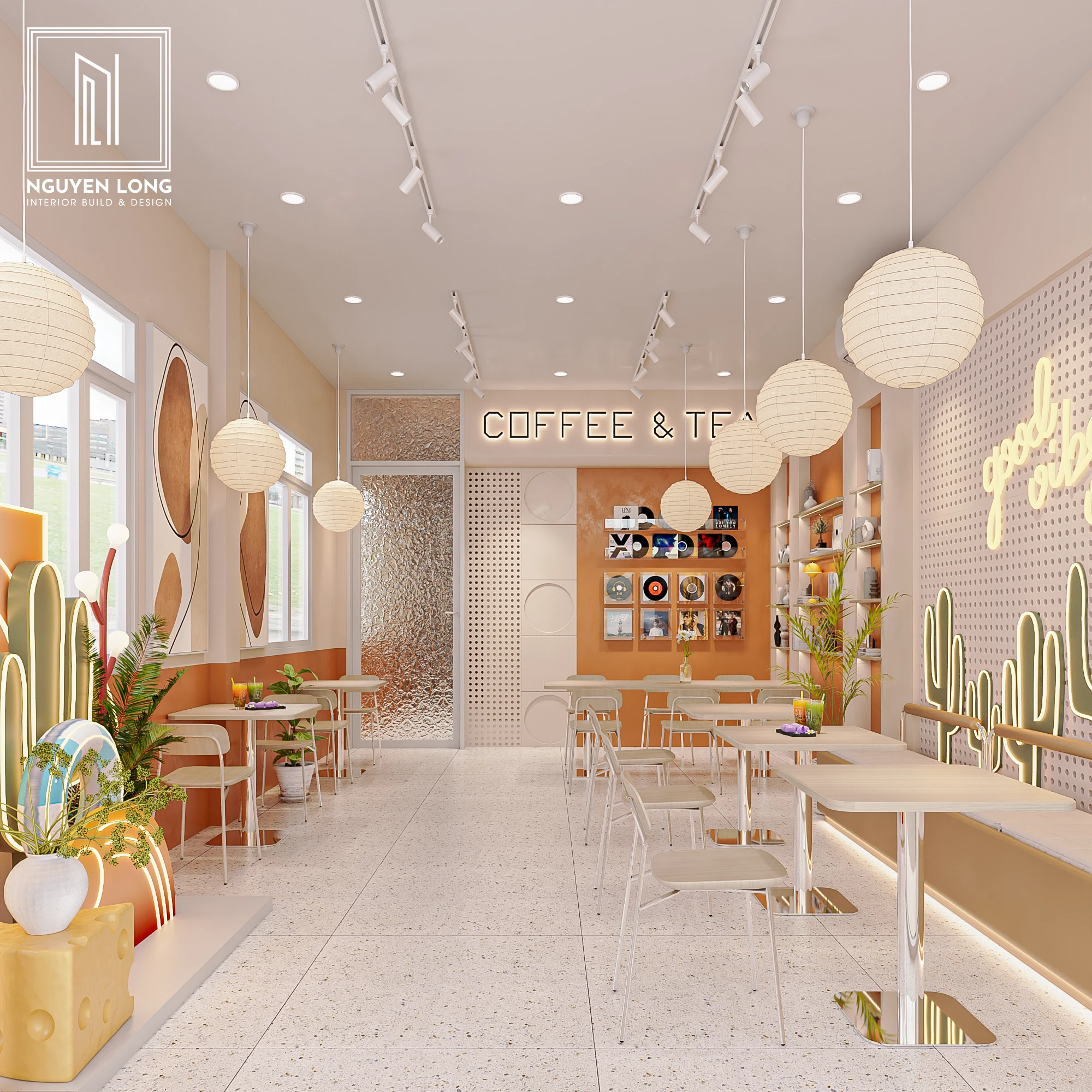 Neon Sign & LED Decor: Biển hiệu Neon uốn cong với thông điệp tích cực ("good vibes only") và các hình khối nghệ thuật Neon ở góc decor, tạo ra một góc check-in cực kỳ ấn tượng và mang tính nhận diện thương hiệu cao.