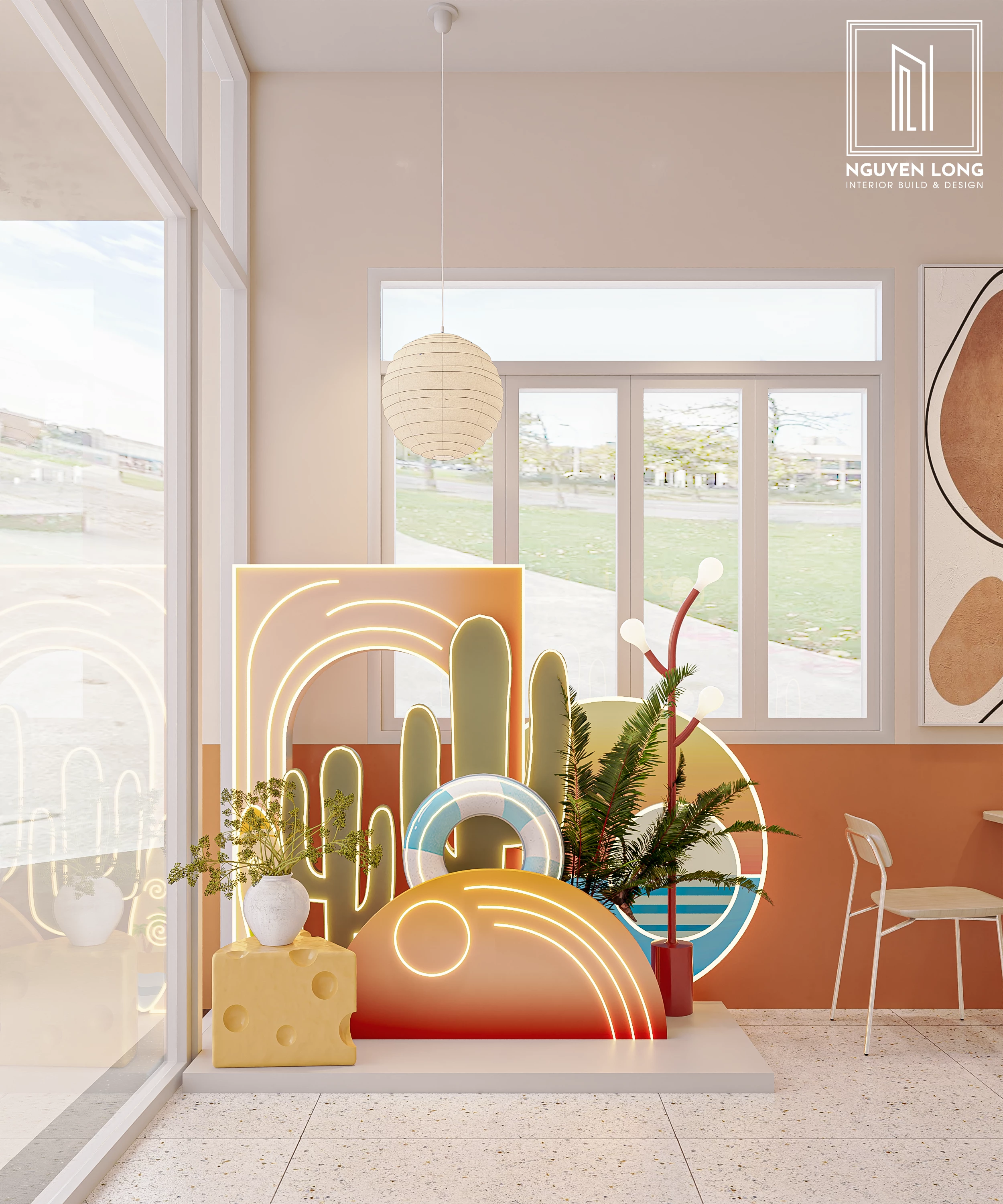 Sân Khấu Nghệ Thuật: Khu vực cửa sổ được trang trí bằng một bục nhỏ với các khối hình học, cây xương rồng, và ánh sáng Neon nhiều màu, tạo nên một tác phẩm sắp đặt (Installation Art) nổi bật dưới ánh sáng tự nhiên.