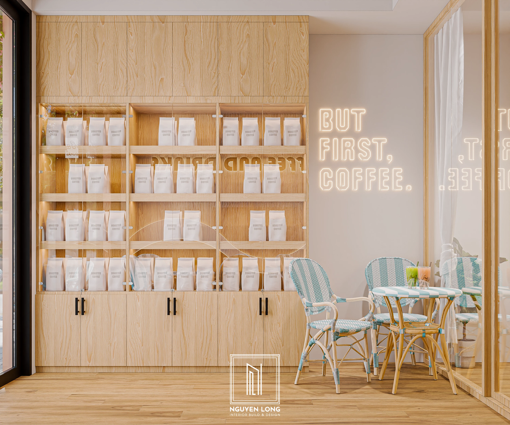 Hệ kệ trưng bày chuyên nghiệp: Tủ gỗ cao đụng trần trưng bày các dòng cà phê hạt được thiết kế chỉn chu, vừa là điểm nhấn trang trí, vừa khẳng định sự tâm huyết của chủ nhân với từng tách đồ uống.