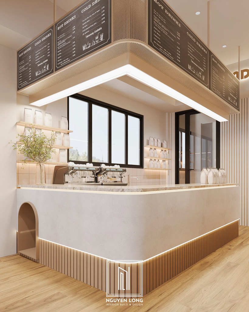 Quầy Bar thanh lịch: Thiết kế quầy Bar tối giản với những đường rãnh gỗ chạy dọc tinh tế, kết hợp mặt đá vân mây sang trọng. Hệ thống menu bảng đen treo phía trên mang lại nét cổ điển, gần gũi.