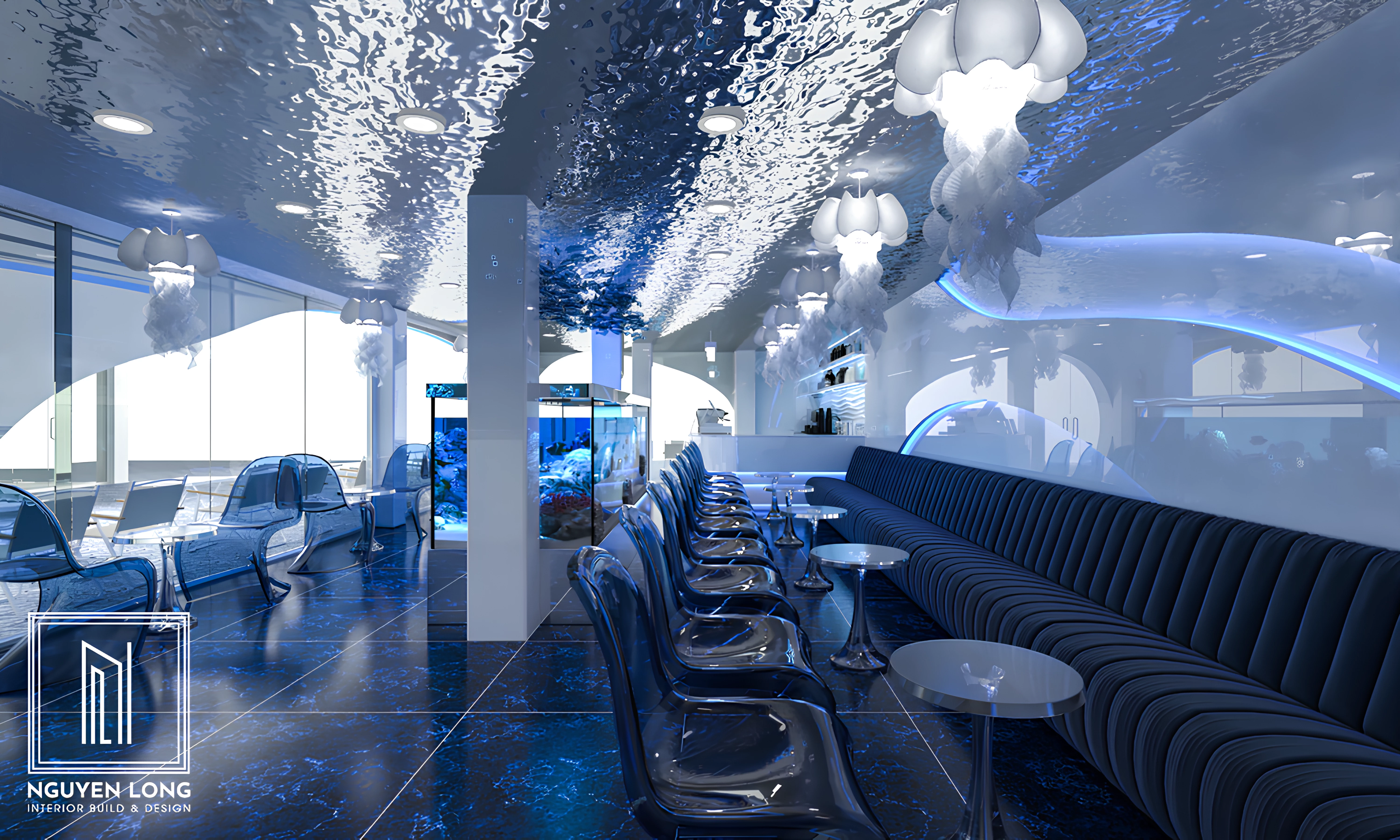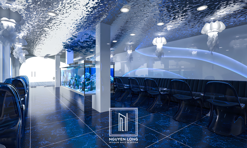 Vật liệu Inox gương sóng: Nguyen Long Interior sử dụng tấm inox 3D gương bóng loáng với các nếp nhăn tự nhiên. Khi ánh đèn chiếu vào, toàn bộ trần nhà hiện lên như mặt nước dập dềnh, phản chiếu mọi hoạt động phía dưới, tạo cảm giác như khách hàng thực sự đang ngồi dưới đáy một hồ nước trong vắt.