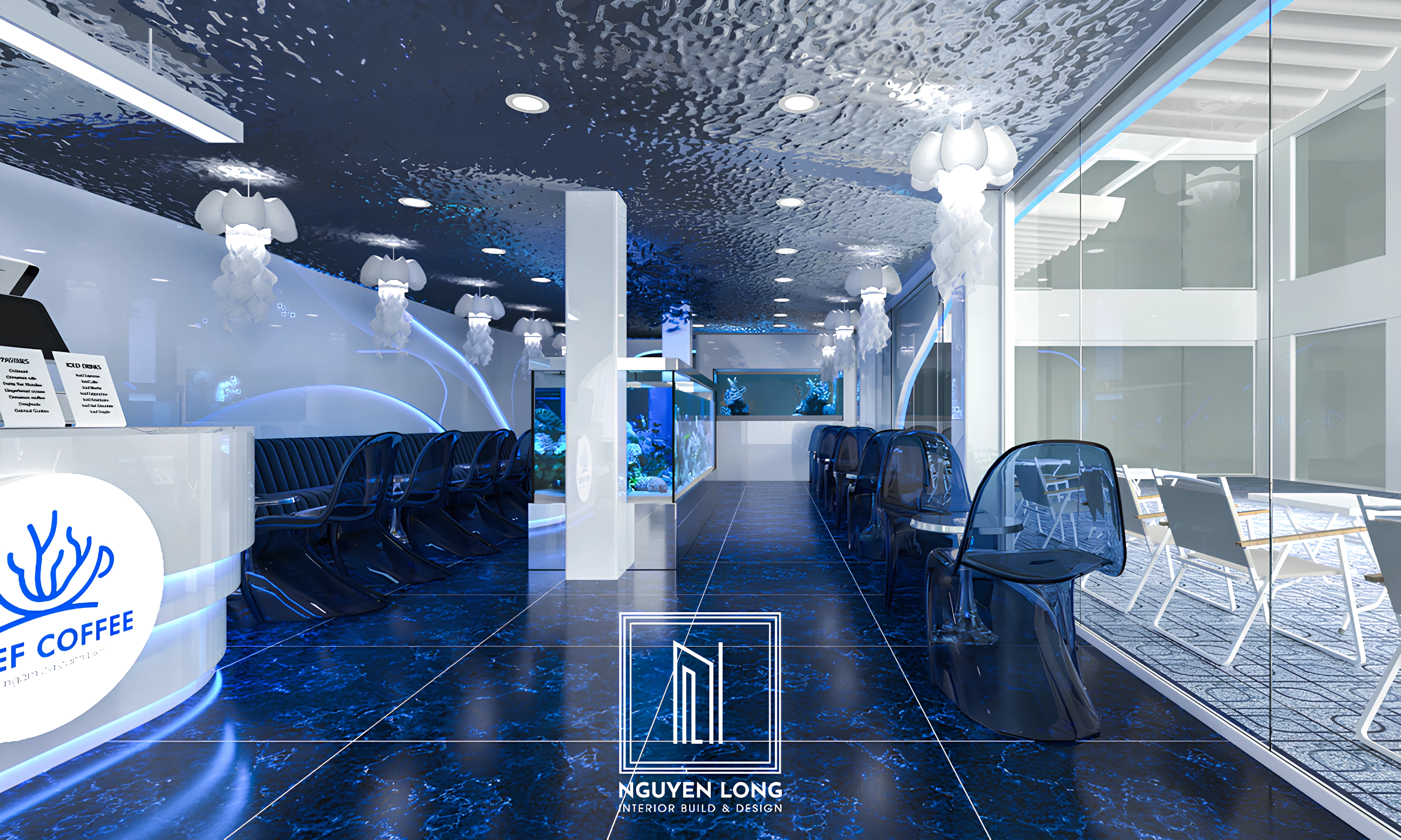 Dự án Reef Coffee là một cuộc hành trình đưa khách hàng rời xa cái nắng gắt của phố thị để đắm mình vào lòng đại dương huyền ảo. Với ngôn ngữ thiết kế Surrealism (Siêu thực) kết hợp cùng công nghệ vật liệu hiện đại, Nguyen Long Interior đã kiến tạo nên một không gian không chỉ để thưởng thức cà phê, mà còn để "chạm" vào giấc mơ biển cả.