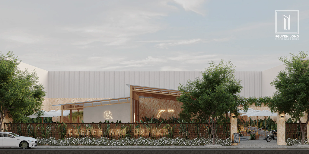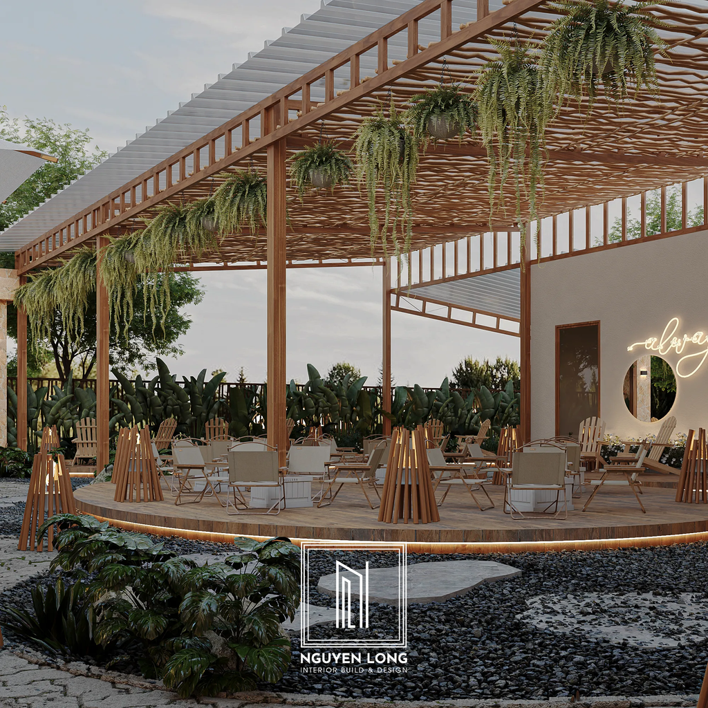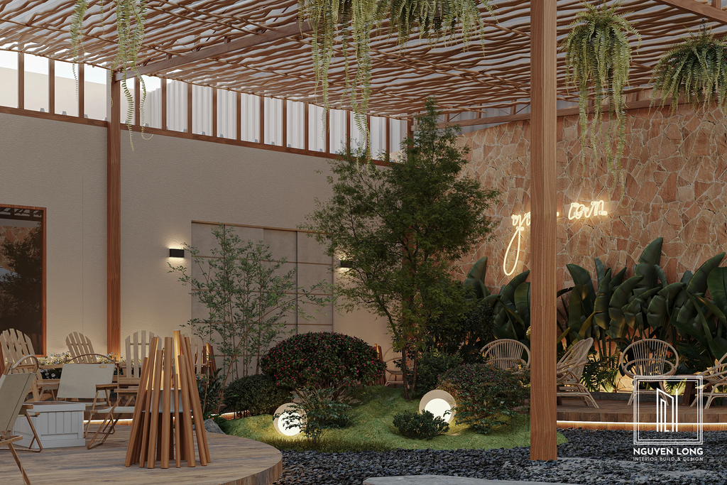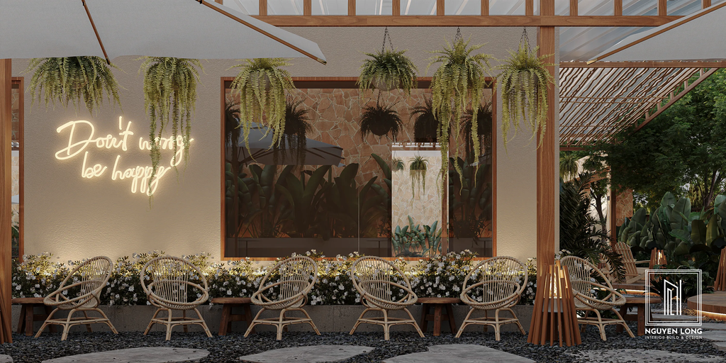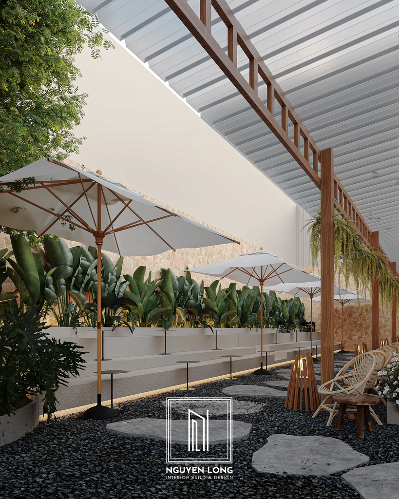 Không gian mở: Các mảng xanh che phủ giúp quán đón trọn luồng không khí tự nhiên, tạo cảm giác thông thoáng và mời gọi khách hàng bước vào một "ốc đảo" tách biệt.
